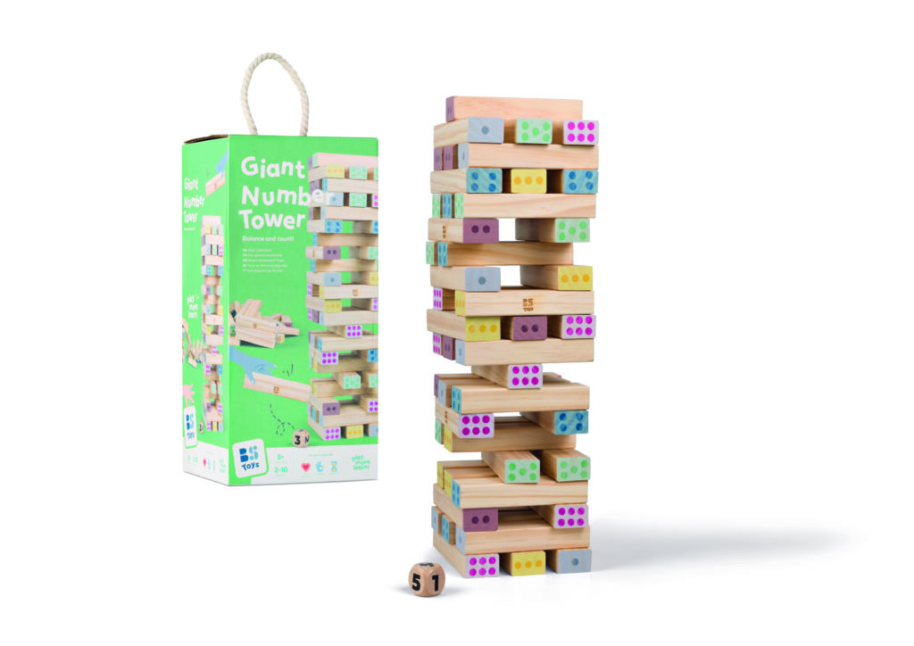 Lancez le dé à tour de rôle et retirez les blocs correspondant au numéro - mais attention à ne pas faire tomber la tour ! Allez-vous choisir un seul bloc ou deux dont la somme donne le même chiffre ?